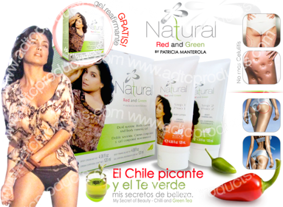 "Los años no pasan solos y generalmente en el caso de nosotras la mujeres vienen acompañados de celulitis y flacidez, pero afortunadamente hace mucho conocí un componente que ha hecho posible que nada de eso me pase, un componente tan Mexicano como yo “El Chile” y el “Té Verde”" por Patricia Manteola., consumidos en Asia y a el se atribuye la delgadez y salud de los orientales. El té verde es el componente usado en pastillas adelgazantes del mundo.